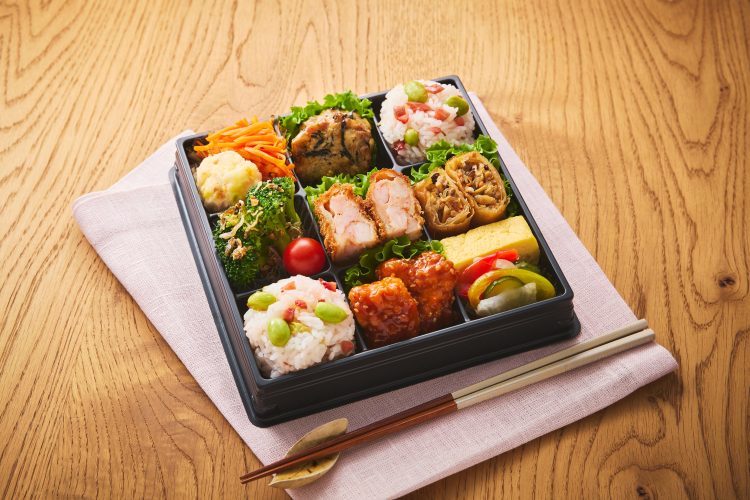 RF1の定番おかず「海老カツレツ」と、野菜の彩りを活かした多種類の副菜を愉しめるお弁当です。