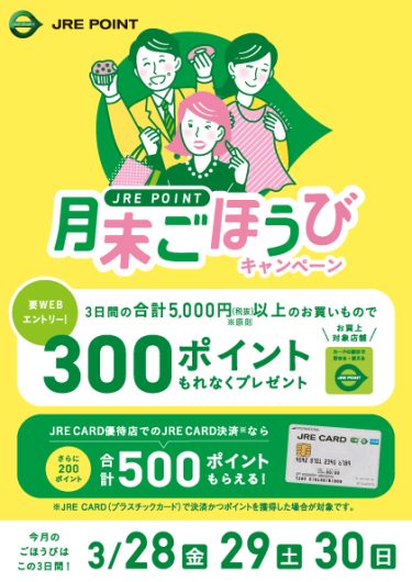 ※JRE POINTカード(アプリバーコード・現金ポイントカード)は原則100円(税抜)につき3ポイント中の2ポイント、JRE CARDクレジット決済5ポイント中の2ポイントが期間限定ポイントとなります。SPECIALプラチナ会員さまはJRE POINTカード(アプリバーコード・現金ポイントカード)は原則100円(税抜)につき4ポイント中の3ポイント、JRE CARDクレジット決済6ポイント中の3ポイントが期間限定ポイントとなります。
